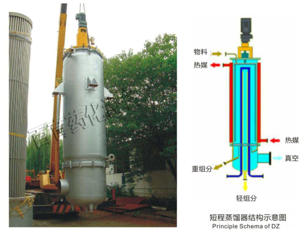 短程分子蒸餾設備的蒸餾是一種在高真空(<10Pa)條件下,在加熱面上被蒸發的分子經過盡可能短的距離到達冷凝面進行冷凝,從而實現液-液分離的蒸餾過程。當加熱面與冷凝面的距離小于或等于操作真空和溫度下的被蒸發分子的平均自由程時,該蒸餾過程也被稱為分子蒸餾。它具有蒸餾溫度低、蒸餾真空度高、受熱時間短、分離程度高等優點,是一種較新的尚未廣泛運用于工業化生產的分離技術。