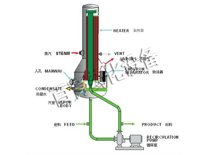 需濃縮的料液由泵送入加熱管頂部,沿著加熱管內壁形成液膜向下流動。在這個過程中,由于管外的加熱,管內液膜開始沸騰并部分蒸發。在列管下部分及其下游的分離器中,剩余的液體和蒸汽得以分離。