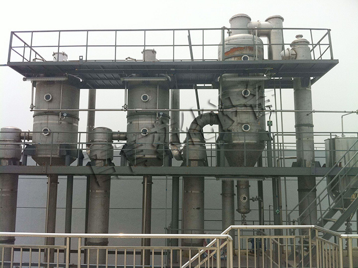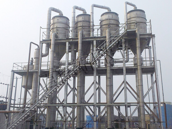 多效強制循環蒸發器由各效蒸發器、各效分離器、冷凝器、循環泵、效間泵、真空及排水系統、分汽缸、操作平臺、電器儀表控制柜及閥門、管路等系統組成。