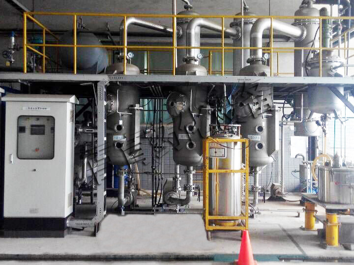 三效蒸發器是將一個蒸發器產生的二次蒸汽再次當作加熱源,引入另一個蒸發器,只要控制蒸發器內的壓力和溶液沸點,使其適當減少,則可利用蒸發器產生的二次蒸汽進行加熱。結晶機此時,蒸發器的冷凝處就是蒸發器的加熱處。
